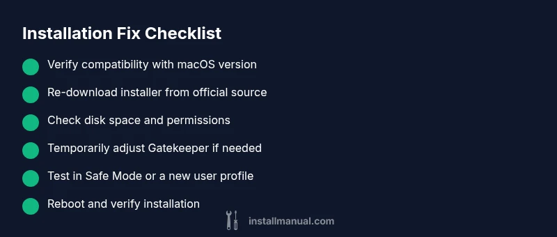 Begin with quick, safe checks: verify the installer matches your macOS version and re-download from the official source. Check disk space, permissions, and your network. If needed, temporarily adjust Gatekeeper settings and retry. Use Safe Mode or a test user to isolate issues. According to Install Manual, most failures stem from permissions, security settings, or corrupted installers. If issues persist, proceed with deeper diagnostics.