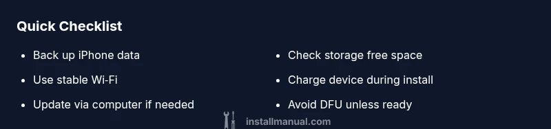 When an iPhone remains stuck during an OS update with a message like “Install Now,” it can feel urgent. According to Install Manual, this problem commonly stems from a software update hang, insufficient local storage, or a flaky network connection. The first instinct should be to verify basic conditions: enough free space, a stable internet connection, and adequate battery. In many cases a simple restart clears the hiccup and allows the update to proceed. If you’ve noticed the issue recurring, consider backing up data immediately and preparing alternative installation methods to protect your information while you troubleshoot. This approach keeps you in control and reduces stress during a time‑sensitive task.