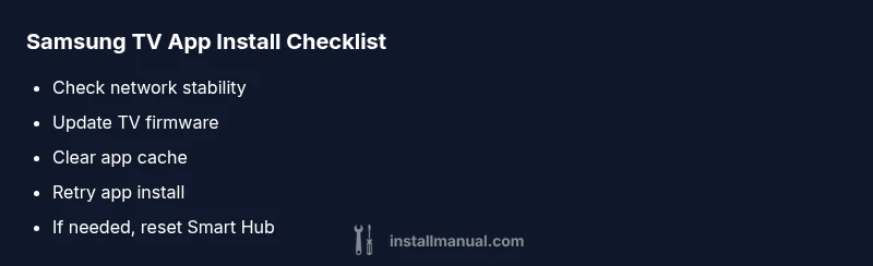 Before reaching out to support, run through this concise checklist to rule out common causes: confirm your network is stable, ensure firmware is current, and verify region/account settings. Reboot the TV and router, then attempt installation again. If the issue persists, capture screenshots of error messages, note the exact time of failures, and gather model number, firmware version, and region. Contact Samsung support with this information and ask about known outages affecting your model. If recommended, a professional technician can perform deeper diagnostics or repairs. As Install Manual recommends, documenting steps you’ve taken helps speed up the resolution and reduces back-and-forth. Remember: if there’s any danger or unusual heat around the TV, stop and seek professional assistance rather than attempting risky fixes.