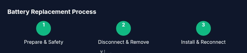 stepByStep":{"steps":[{"number":1,"title":"Prepare and safety check","description":"Park on a level surface, engage the parking brake, and turn off the engine. Remove the key and ensure no accessories are active. Gather all required tools before you start to avoid interruptions.","tip":"Take a photo of terminal wiring before disconnecting to avoid reassembling mistakes."},{"number":2,"title":"Disconnect the negative terminal","description":"Loosen the nut on the negative cable and carefully lift the clamp off the terminal. Keep the nut in a safe place so it isn’t lost, as you’ll need it to reconnect later.","tip":"Always remove the negative first to minimize arcing risk."},{"number":3,"title":"Disconnect the positive terminal","description":"Repeat the process for the positive terminal, keeping the wrench away from any metal surfaces to prevent short circuits.","tip":"Do not touch both terminals with metal tools at the same time."},{"number":4,"title":"Remove hold-down and lift old battery","description":"Loosen the hold-down bracket and lift the old battery straight up using two hands. Batteries are heavy, so use proper lifting posture to avoid back strain.","tip":"If the battery is stubborn, gently wiggle while lifting—never pry with metal objects."},{"number":5,"title":"Clean tray and inspect area","description":"Check the battery tray for corrosion or cracks. Clean the terminals and tray with a terminal cleaner or baking soda solution if needed, and dry thoroughly.","tip":"A clean tray helps prevent battery movement and leaks."},{"number":6,"title":"Install the new battery","description":"Place the new battery in the tray with the terminals oriented correctly. Reattach the hold-down and snug it to spec without overtightening.","tip":"Ensure the battery sits flat and does not rock in the tray."},{"number":7,"title":"Reconnect terminals and test","description":"Connect the positive terminal first, then the negative. Tighten clamps securely and start the engine to confirm proper operation and that warning lights are off.","tip":"If the car won’t start, recheck the polarity and ensure clamps are clean and tight."},{"number":8,"title":"Cleanup and disposal","description":"Wipe any spills and store tools. Recycle the old battery at an authorized facility and keep the receipt for warranty records.","tip":"Always use a certified recycler for hazardous waste handling."} ],