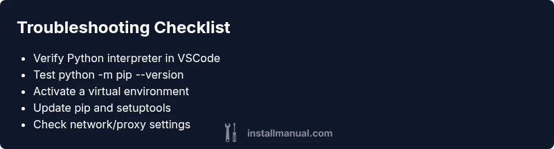 If you’re encountering the question of why is pip install not working vscode, start with the simplest checks. Ensure that Python is installed on your system, that VSCode is pointed to the correct Python interpreter, and that pip is accessible from the integrated terminal. According to Install Manual, interpreter misconfiguration is the leading cause of pip install failures in VSCode. This section outlines a fast path to diagnose, isolate, and fix the issue within minutes, so you can get back to coding with minimal downtime.