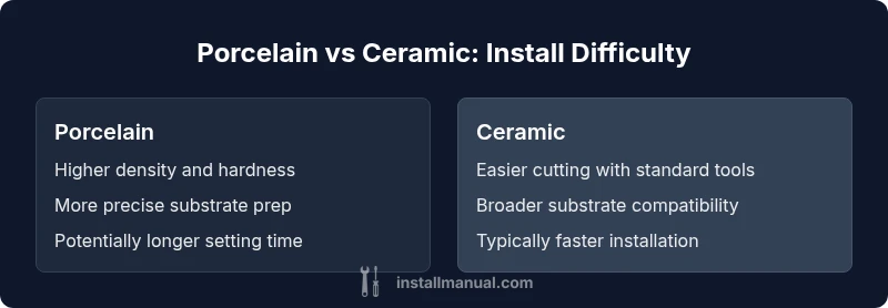The question "is porcelain harder to install than ceramic" is common among homeowners planning tile projects. The short answer is that porcelain often poses more challenges, but the degree of difficulty depends on the project specifics: tile size, room layout, substrate health, and the installer’s experience. According to Install Manual, the real issue isn't a single attribute but a combination of material properties and workmanship requirements. Porcelain tiles typically have higher density, lower porosity, and a glaze or body that can be more rigid. That combination affects how easily tiles cut, how well they bond, and how tolerant the final surface will be to uneven floors or walls. Ceramics, by contrast, tend to be a bit more forgiving: they cut more easily, tolerate minor substrate irregularities, and often work with a broader range of adhesives. Framing the comparison this way helps homeowners understand where the install burden lies and what to discuss with a contractor before you buy materials.