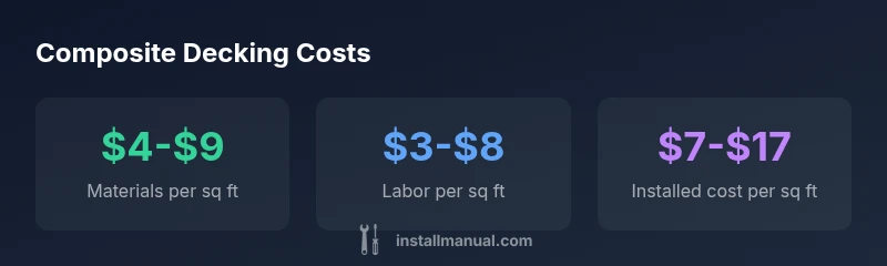 Composite decking installation typically runs $7-$17 per square foot installed, influenced by materials, layout, and railing needs. Larger or more ornate decks raise costs. For a 300–400 sq ft project, expect a broad range and compare several bids. This guide from Install Manual breaks down price drivers and budgeting tips.