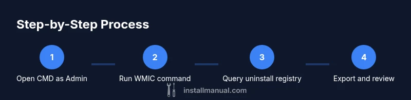 - Open an elevated CMD window. 2) Run 'wmic product get name,version' and save output. 3) Run registry queries for 64-bit and 32-bit uninstall entries and save. 4) Consolidate, sort, and deduplicate. 5) Cross-check with Settings > Apps & Features. 6) Export final master list to a shareable file. 7) Review any missing programs and note portable apps as exceptions. This approach gives a practical, auditable inventory you can rely on when troubleshooting software issues or planning an upgrade.