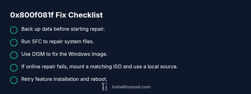 0x800f081f is a signal that Windows cannot complete the requested feature install because required component files are missing or damaged. For homeowners and DIY enthusiasts, this error often shows up when turning on legacy features like .NET Framework 3.5, or during operating-system repair tasks. The Install Manual team notes that the root cause is usually a corrupted component store (CBS) or an incomplete Windows Update image. A successful fix hinges on confirming your system is healthy, has a reliable update source, and can access Microsoft servers if online repair is used. Before jumping into repair steps, confirm your system clock is correct, your internet connection is stable, and you are using the same Windows version as your install media. A small mismatch can trigger 0x800f081f even when your hardware is fine. Quick checks set the stage for a safe, repeatable fix.